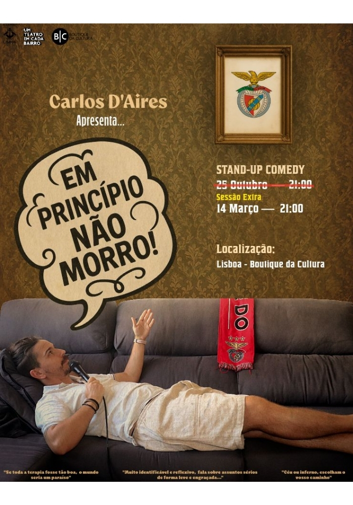 O humorista Carlos D’Aires apresenta o seu novo solo “Em Principio Não Morro!”, um espetáculo onde a comédia se cruza com a terapia e a introspeção.